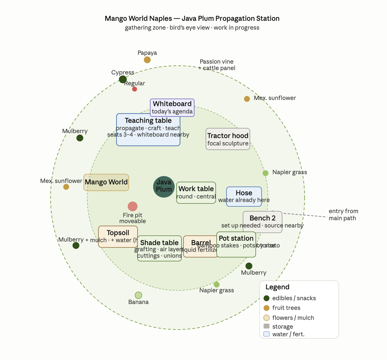 A place to sit. A place to have lunch. A grafting station, a propagation table — this is where the magic begins. The whole perimeter still being planted out, the vision still taking shape.