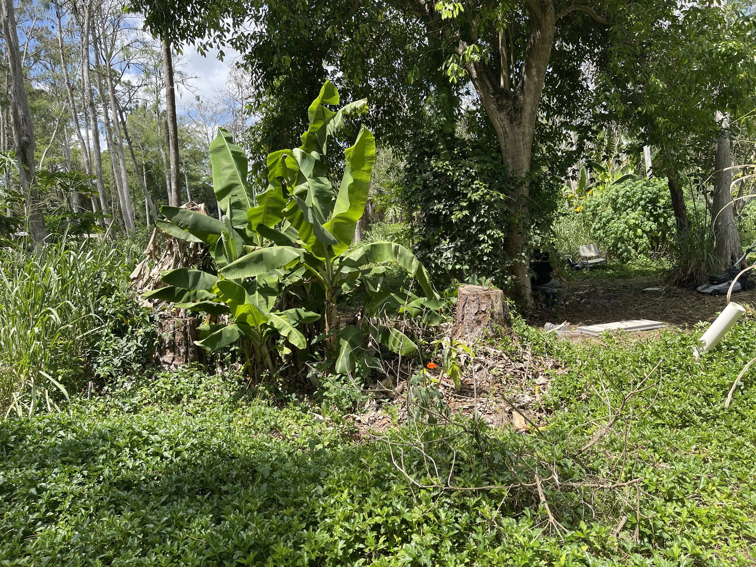 What's grown up beneath them is ours. Mangoes, soursop, plantains, pink guava, dwarf nam-wan banana, blue java banana, papaya — the understory filling out now with things worth harvesting.
